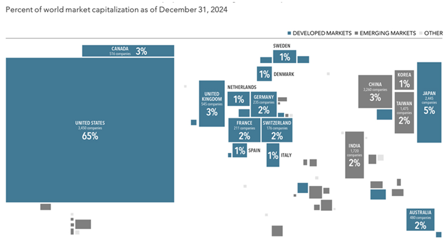 Dimensional Fund Advisors, used by permission. In USD. Diversification neither assures a profit nor guarantees against loss in a declining market. Market cap data is free-float adjusted and meets minimum liquidity and listing requirements. Dimensional makes case-by-case determinations about the suitability of investing in each emerging market, making considerations that include local market accessibility, government stability, and property right before making investments. China A-shares that are available for foreign investors through the Hong Kong Stock Connect program are included in China. 30% foreign ownership limit and 25% inclusion factor are applied to China A-shares. Many nations not displayed. Totals may not equal 100% due to rounding. For educational purposes; should not be used as investment advice. Bloomberg data provided by Bloomberg.