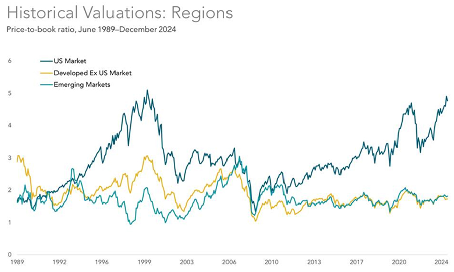 Dimensional Fund Advisors, used by permission. In USD. The Fama/French Indices represent academic concepts that may be used in portfolio construction and are not available for direct investment or for use as a benchmark. Source: CRSP and Compustat data calculated by Dimensional. Fama/French data provided by Fama/French. US Market represented by the Fama/French Total US Market Research Index. Developed Ex US Market represented by the Fama/French International market Research Index. Emerging Markets represented by the Fama/French Emerging Markets Index. Monthly aggregate price-to-book ratios are computed as the inverse of the weighted averbook-to-marketvalue as of month-end. Firms with negative book value are excluded. Book-to-market ratios above 10 are winsorized as the cutoff value in non-US Markets.